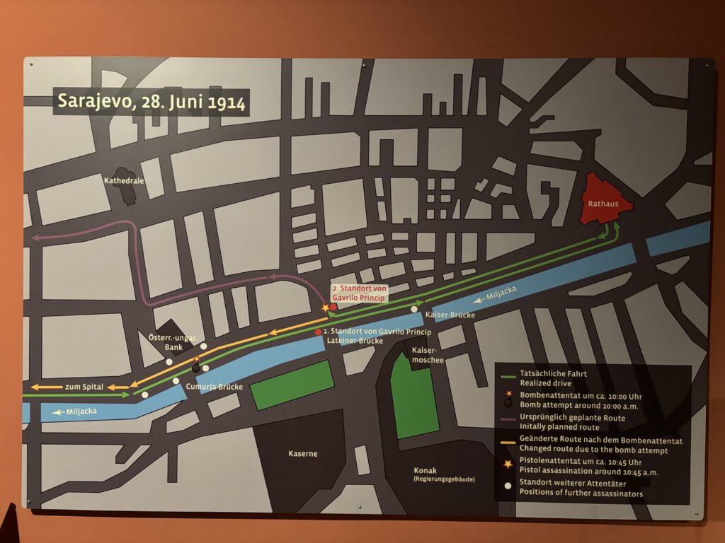 Im Zuge der Führung wurde auch das Attentat von Sarajevo thematisiert. Dabei erfuhren die Schüler:innen, wie eine Reihe von Zufällen und unvorhergesehenen Ereignissen dazu beitrug, dass das Attentat letztlich genau in dieser Form stattfand. Besonders eindrucksvoll war in diesem Zusammenhang das originale Fahrzeug, in dem Erzherzog Franz Ferdinand und seine Frau Sophie erschossen wurden, das im Museum ausgestellt ist.