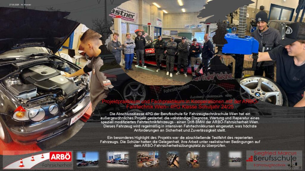 Im Schuljahr 2024/25 setzte die Abschlussklasse 4PG der Berufsschule für Fahrzeugtechnik Wien ein besonderes Praxisprojekt um: die vollständige Diagnose, Wartung und Reparatur eines Fahrtechnikfahrzeugs der ARBÖ-Fahrsicherheit Wien. Das Fahrzeug wurde regelmäßig in intensiven Fahrtechnikkursen eingesetzt und stellte daher besonders hohe Anforderungen an Sicherheit und Zuverlässigkeit.